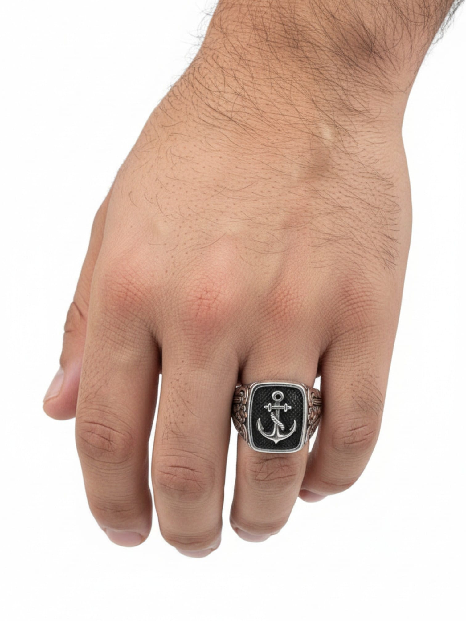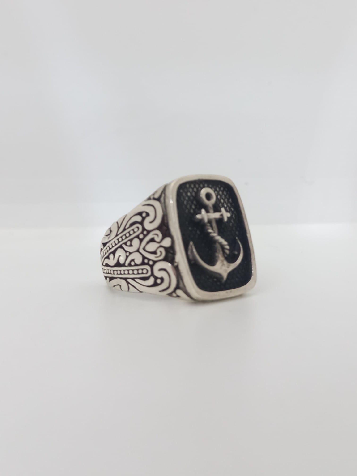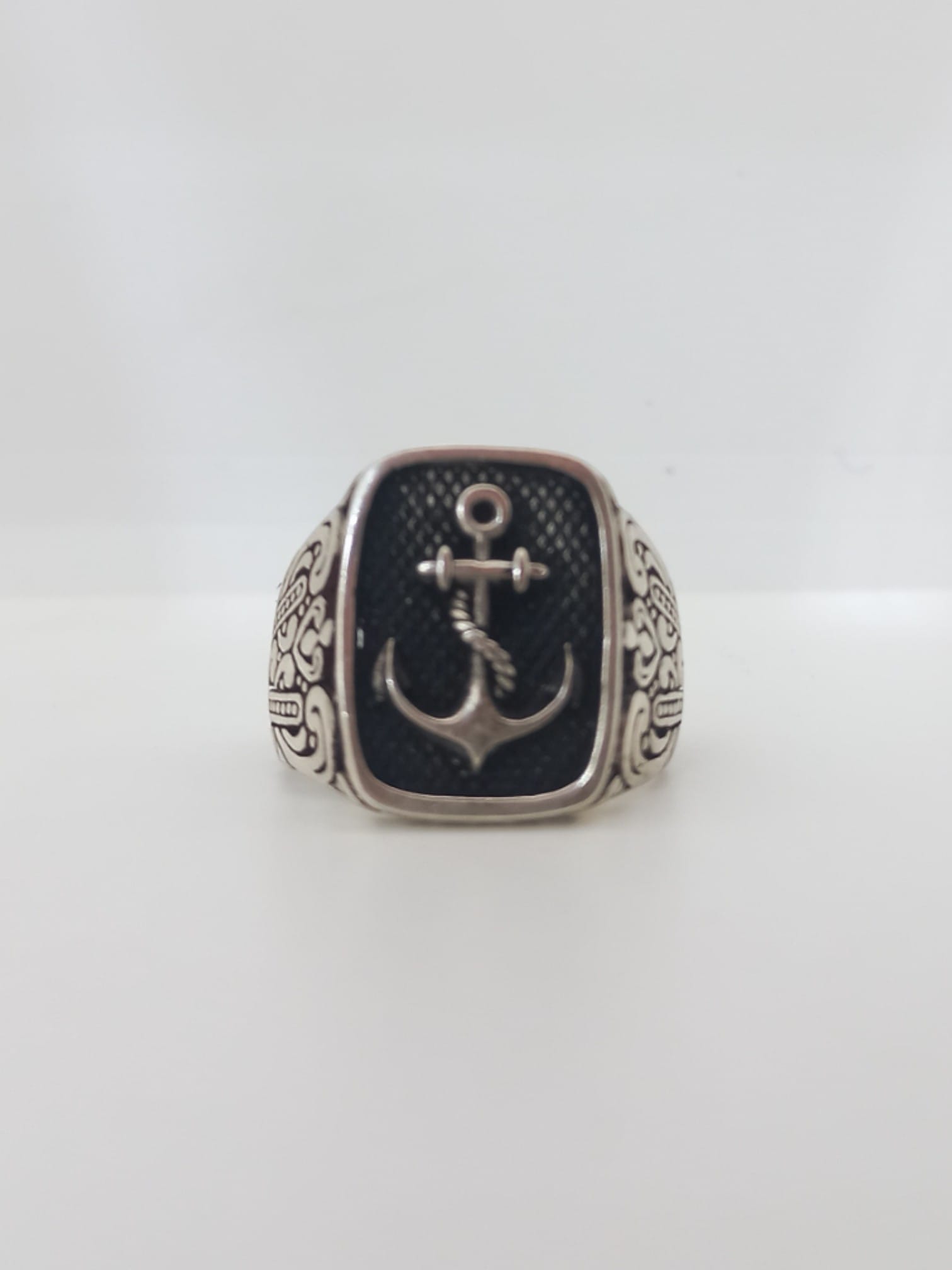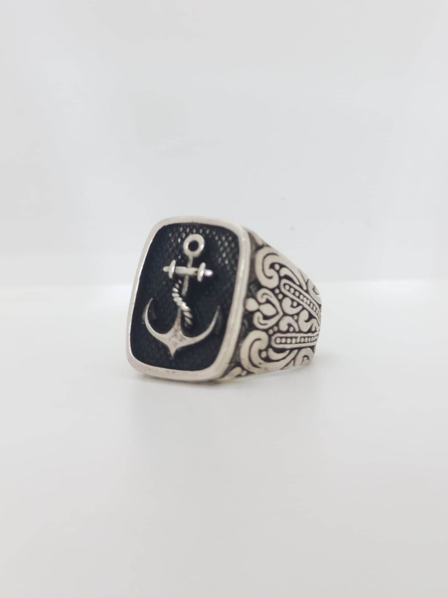 Çapa motifli 925 ayar gümüş erkek yüzük modeli, Tamamen 925 ayar gümüşten üretilen bu modelde Çapa ve Denizci motifleri işlenmiştir.