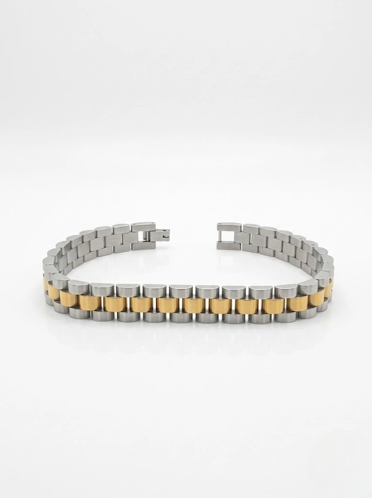 Gümüş renginde çelik bilekliğe altın renk küçük dokunuşlar bilekliğe hareket ve canlılık katıyor,