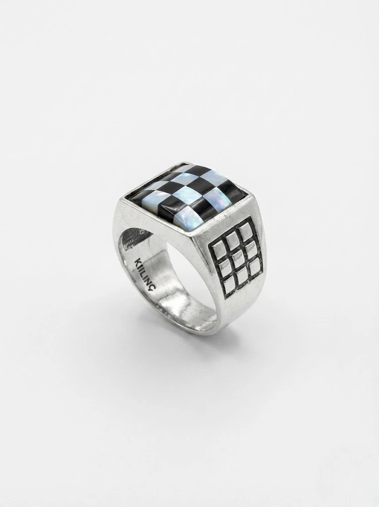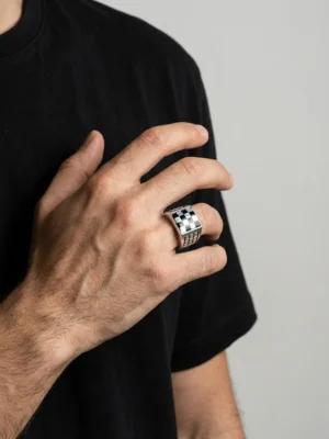 Tamamen 925 ayar gümüşten üretilen dama taşlı erkek yüzük modelinin kol detaylarında da dokuz kareli oyun tahtası motifi işlenmiştir.