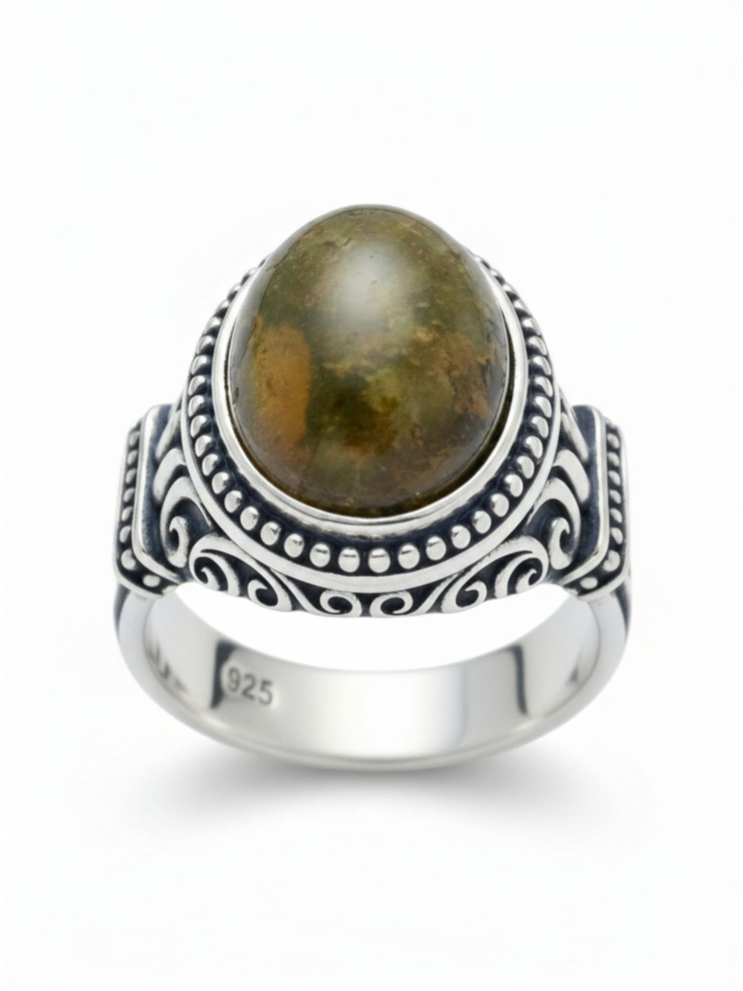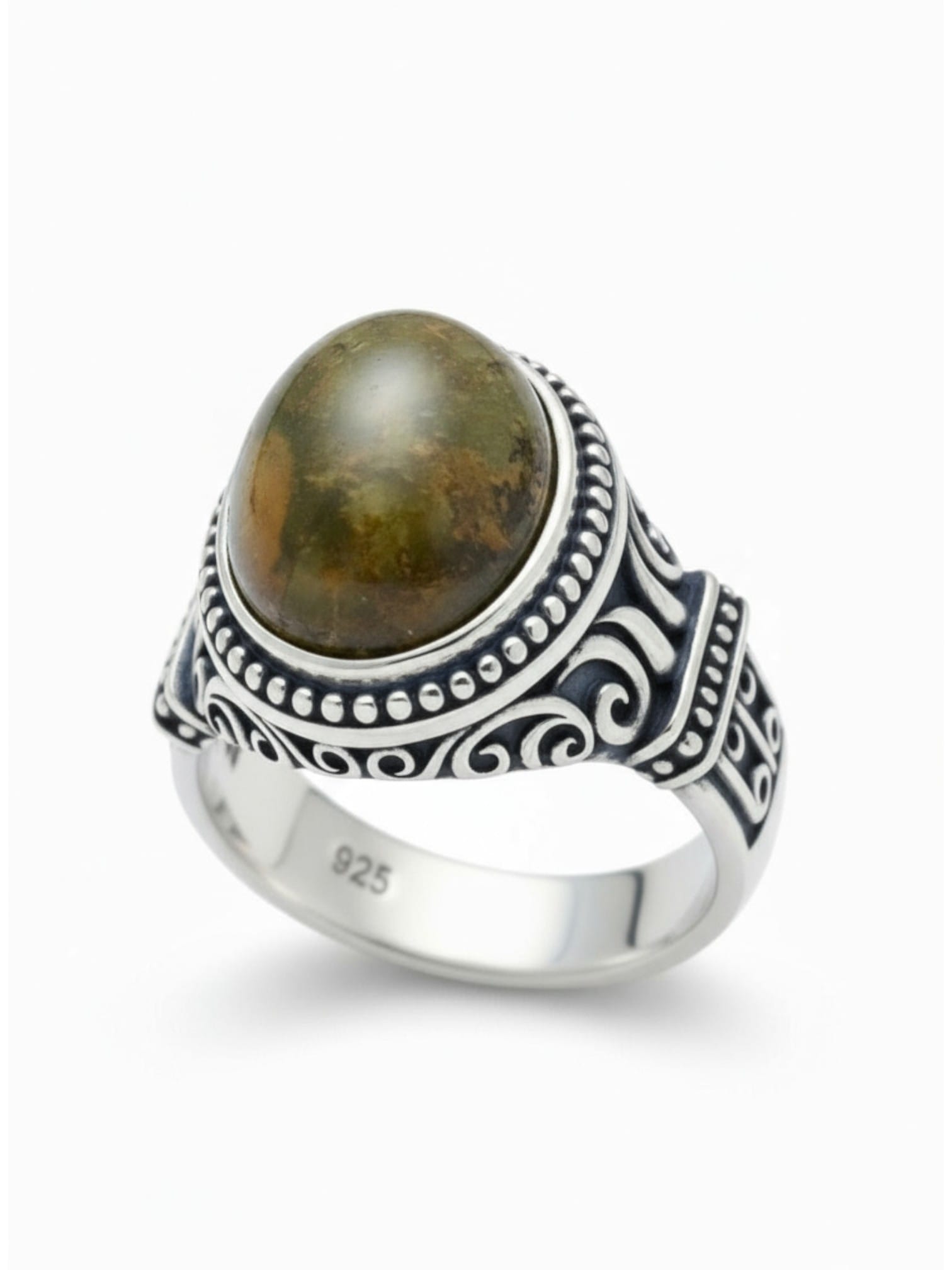 Sade desenlere sahip doğal damla kehribar taşlı erkek gümüş yüzük