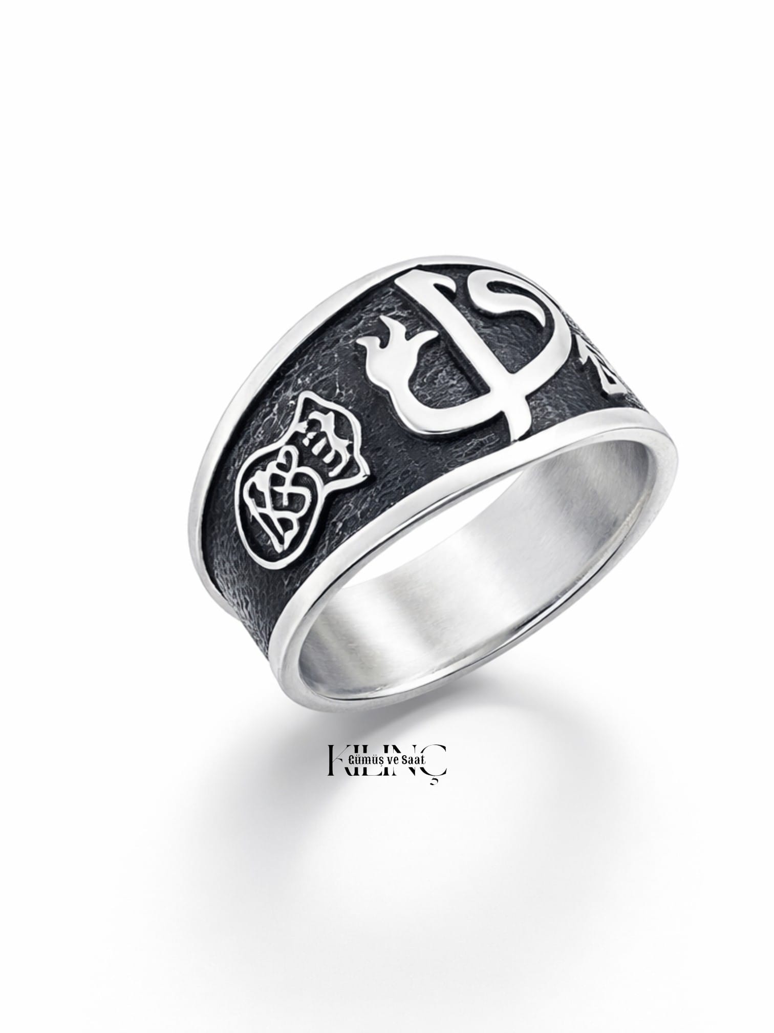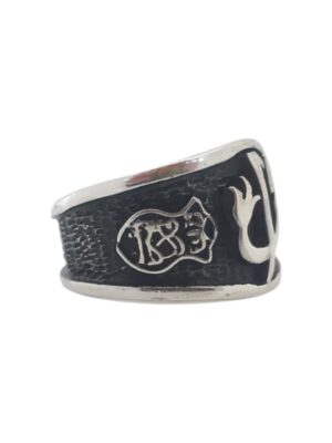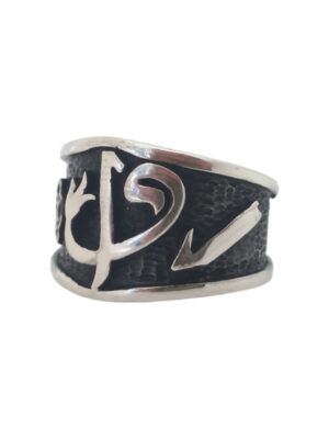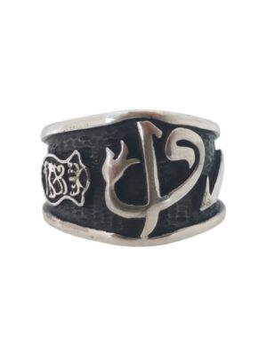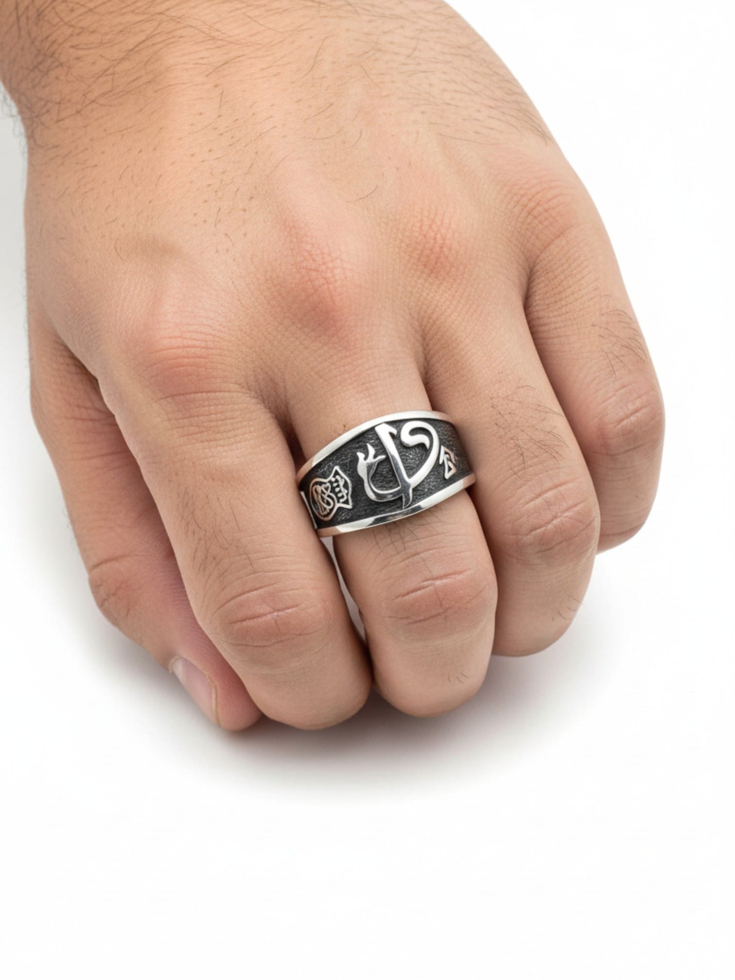 Elif-Vav işlemeli siyah zeminli 925 ayar gümüş erkek yüzük modeli, Manevi değeri yüksek bir modeldir.
