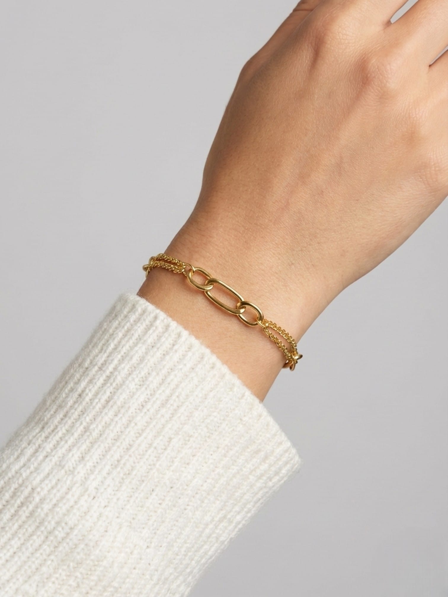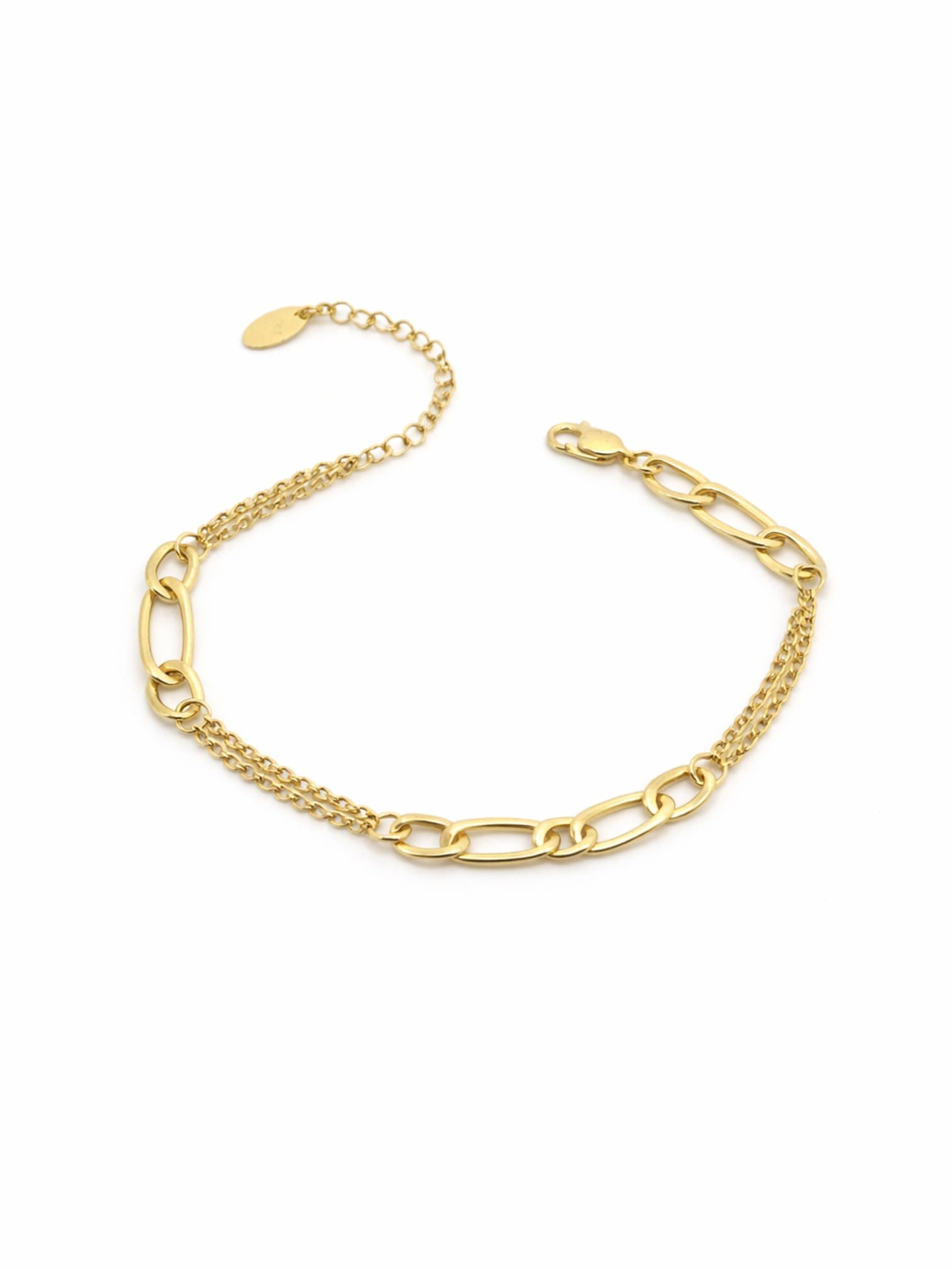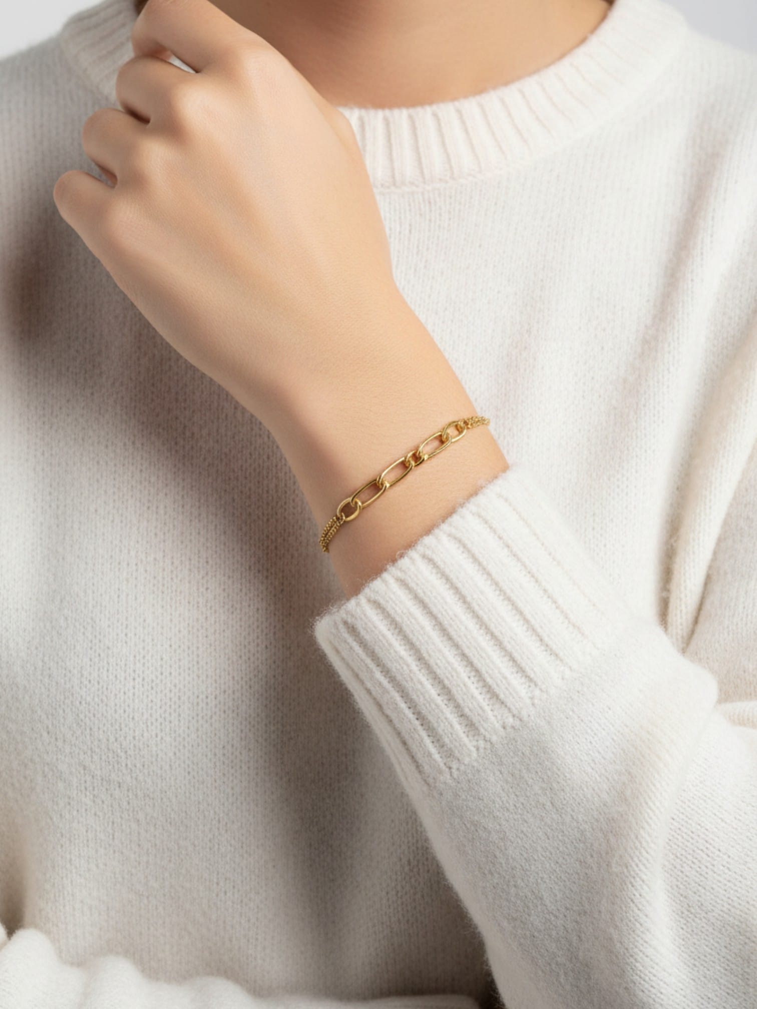 Kadın figaro zincir bilelik modeli, Sade ve günlük bir tasarım, Figaro zincirlerin arasında bağlantı olarak ikili doç zincir kullanılmıştır.