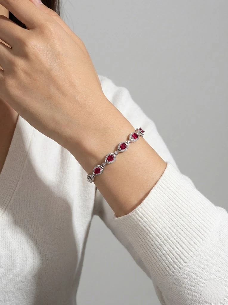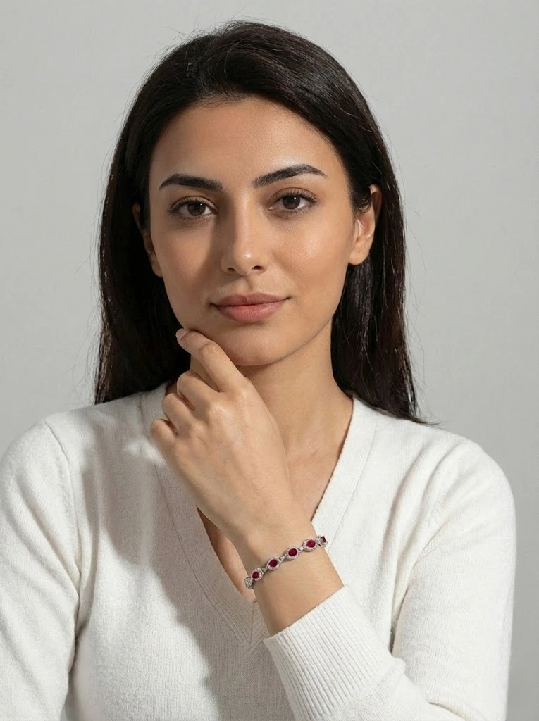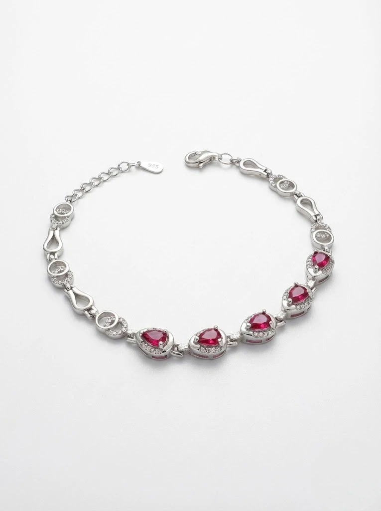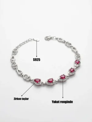 925 ayar gümüşten üretilen kırmızı damla taşlı modelin zincir detaylarında zirkon taşlar kullanılmıştır, Bileklikte tercih edilen taşlar tamamen doğal taşlardır.