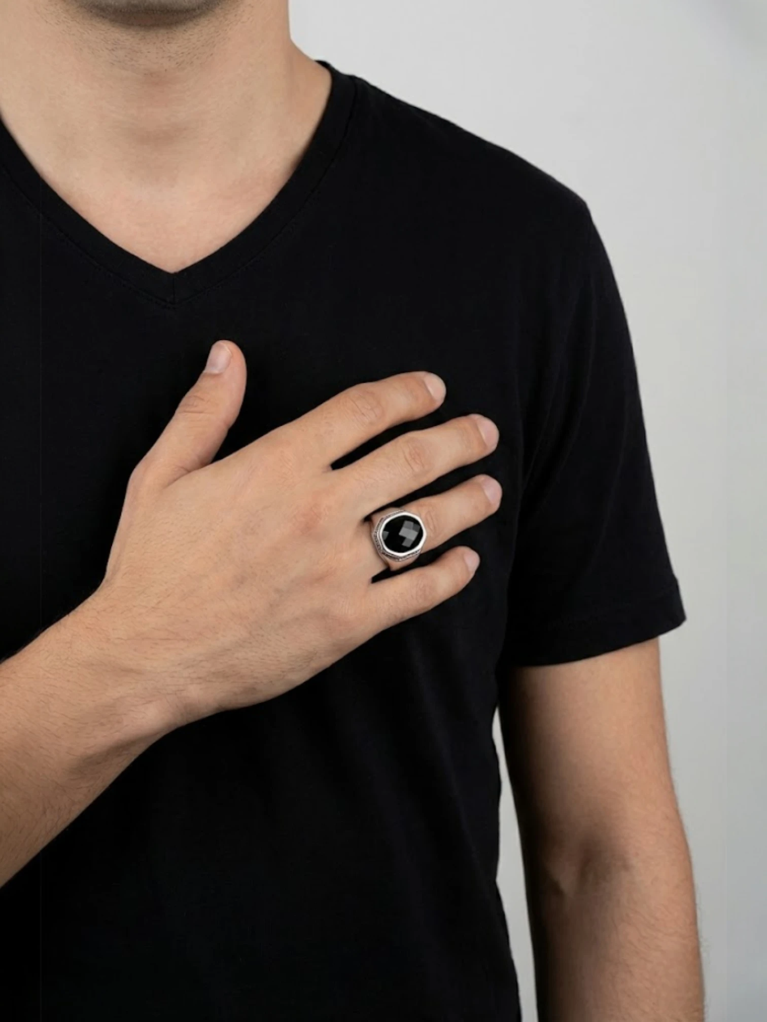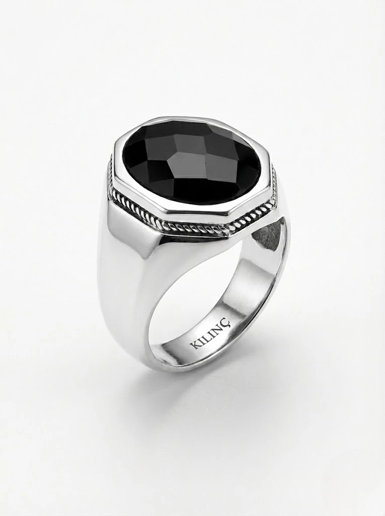 Tamamen 925 ayar gümüşten üretilen kol detayları sade siyah zirkon taşlı erkek yüzük modeli