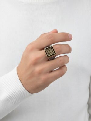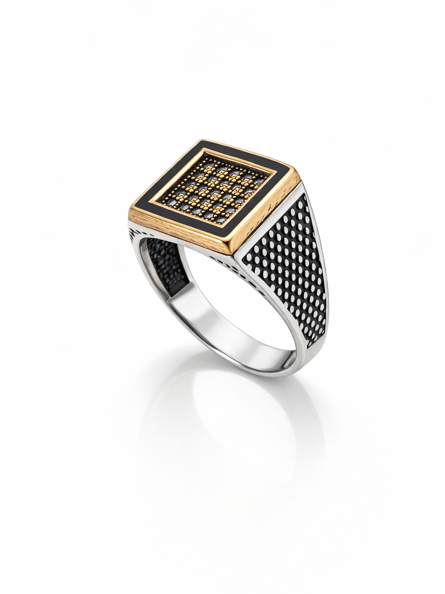 Kare montür üzerine küçük beyaz zirkon taşlarla süslenen erkek yüzük modeli, tamamen 925 ayar gümüşten üretilen bu model hem günlük kullanımlarınıza renk katacak hem de özel davetlerde stilinizi tamamlayacak.
