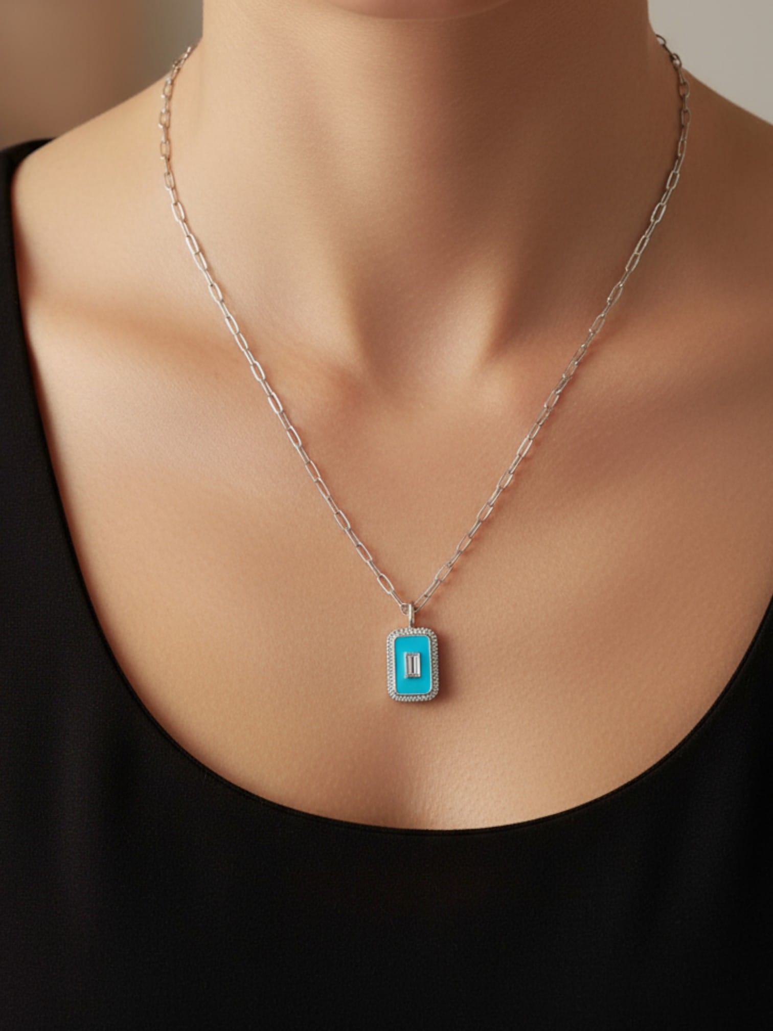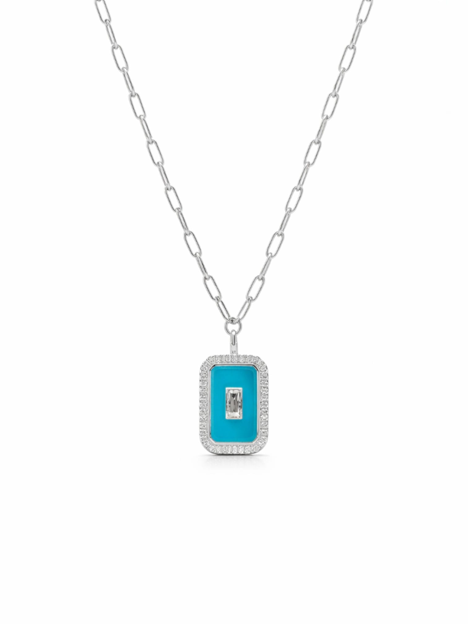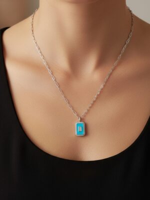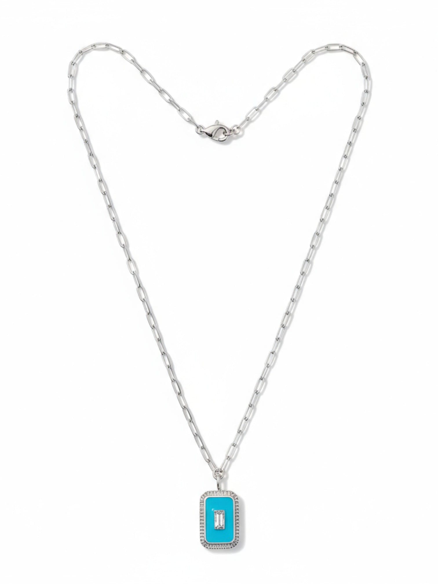 Mavi mineli etrafı baget taşlarla süslenmiş ataç zincir kolye modeli, Tamamen 925 ayar gümüş üzerine rodyum kaplama yapılarak dış etkenlere karşı tam koruma sağlanmıştır.