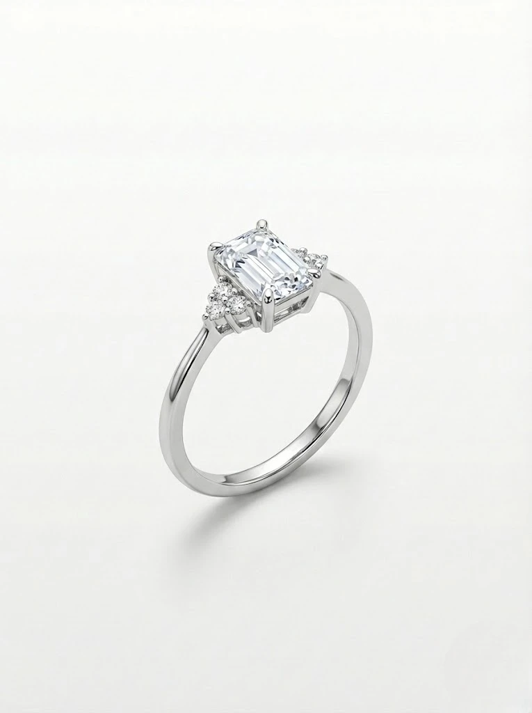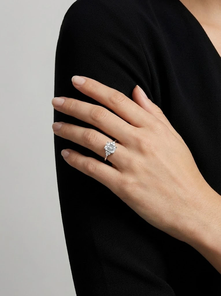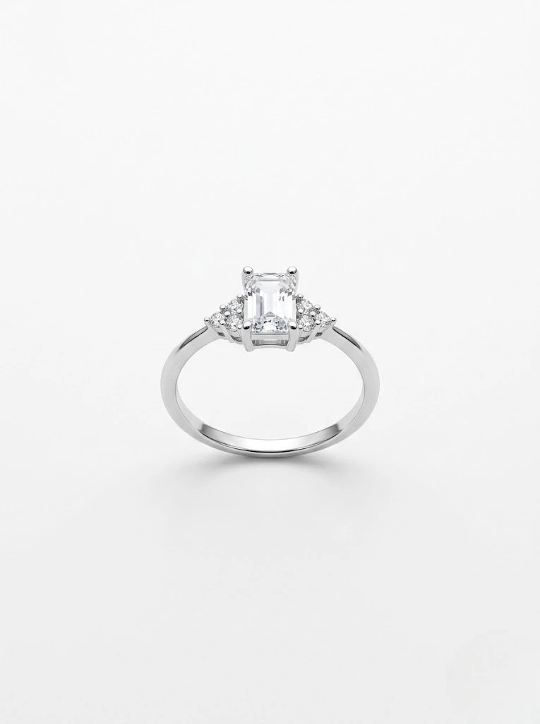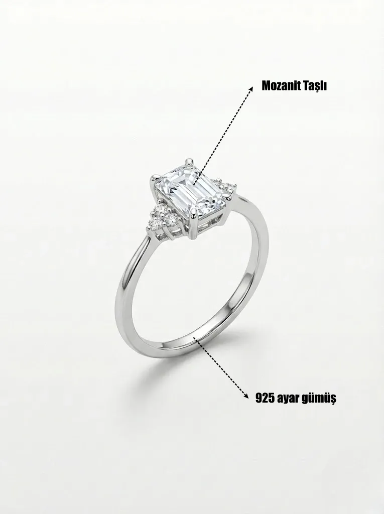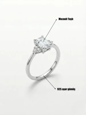 Tamamen 925 ayar gümüşten üretilen minimal baget mozanit taşlı bu modelin yüzeyinde de rodyum kullanılmıştır.
