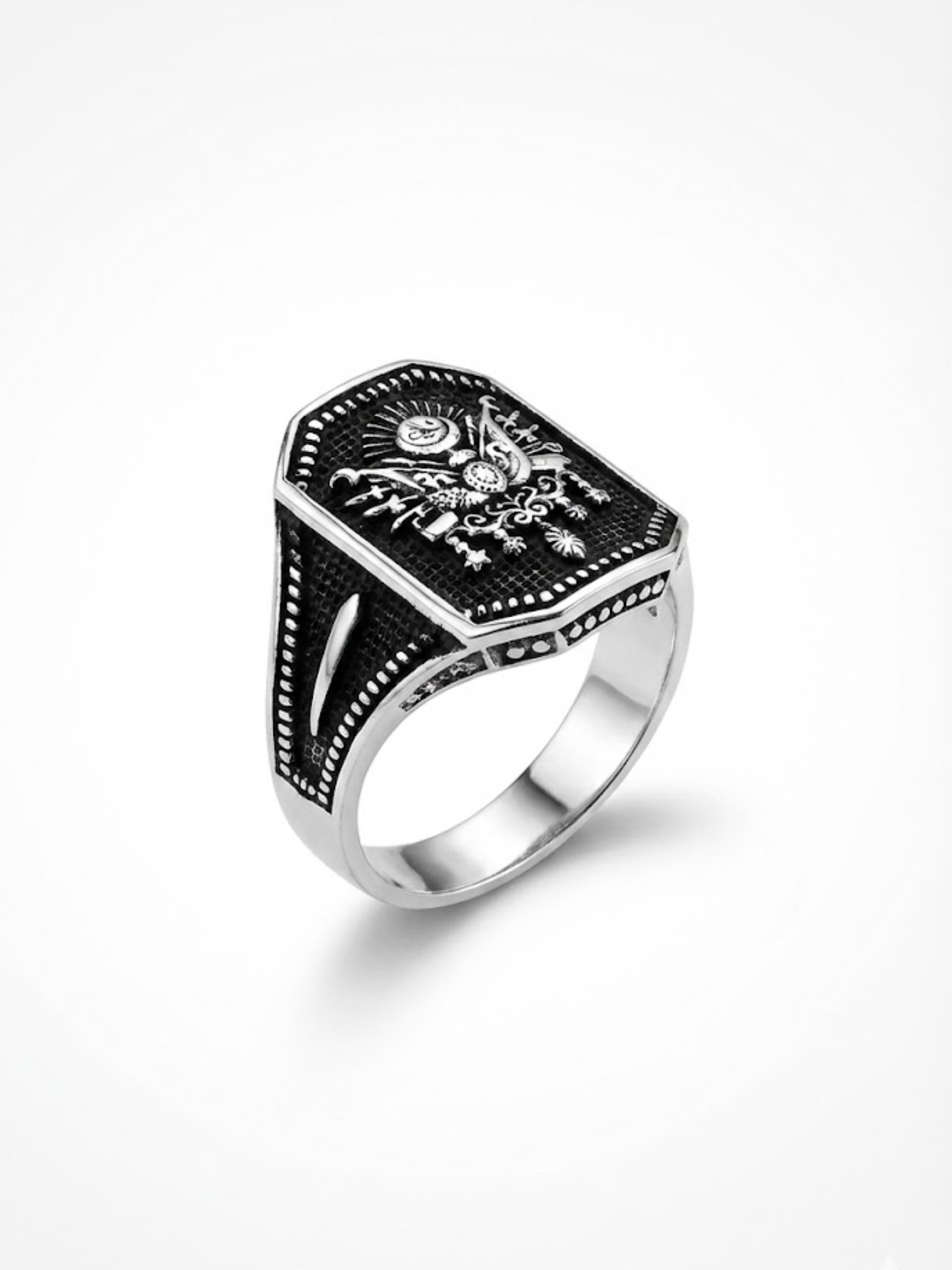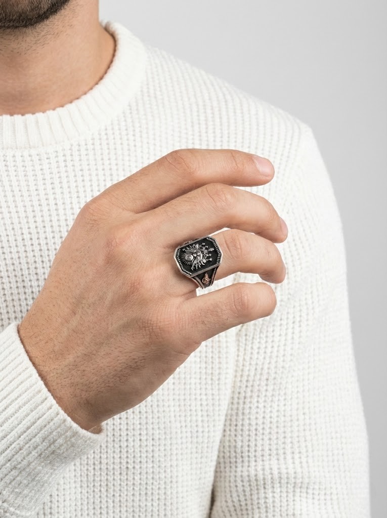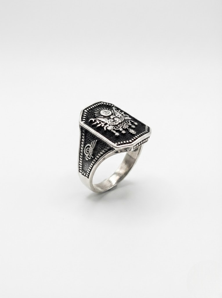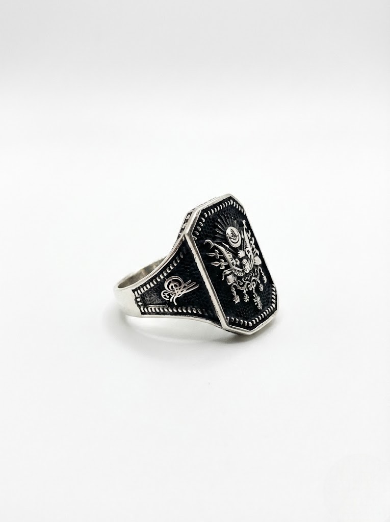 Kol detaylarında Elif-Vav ve Tuğra motifleri işlenmiş Osmanlı temalı 925 ayar gümüş erkek yüzük modeli