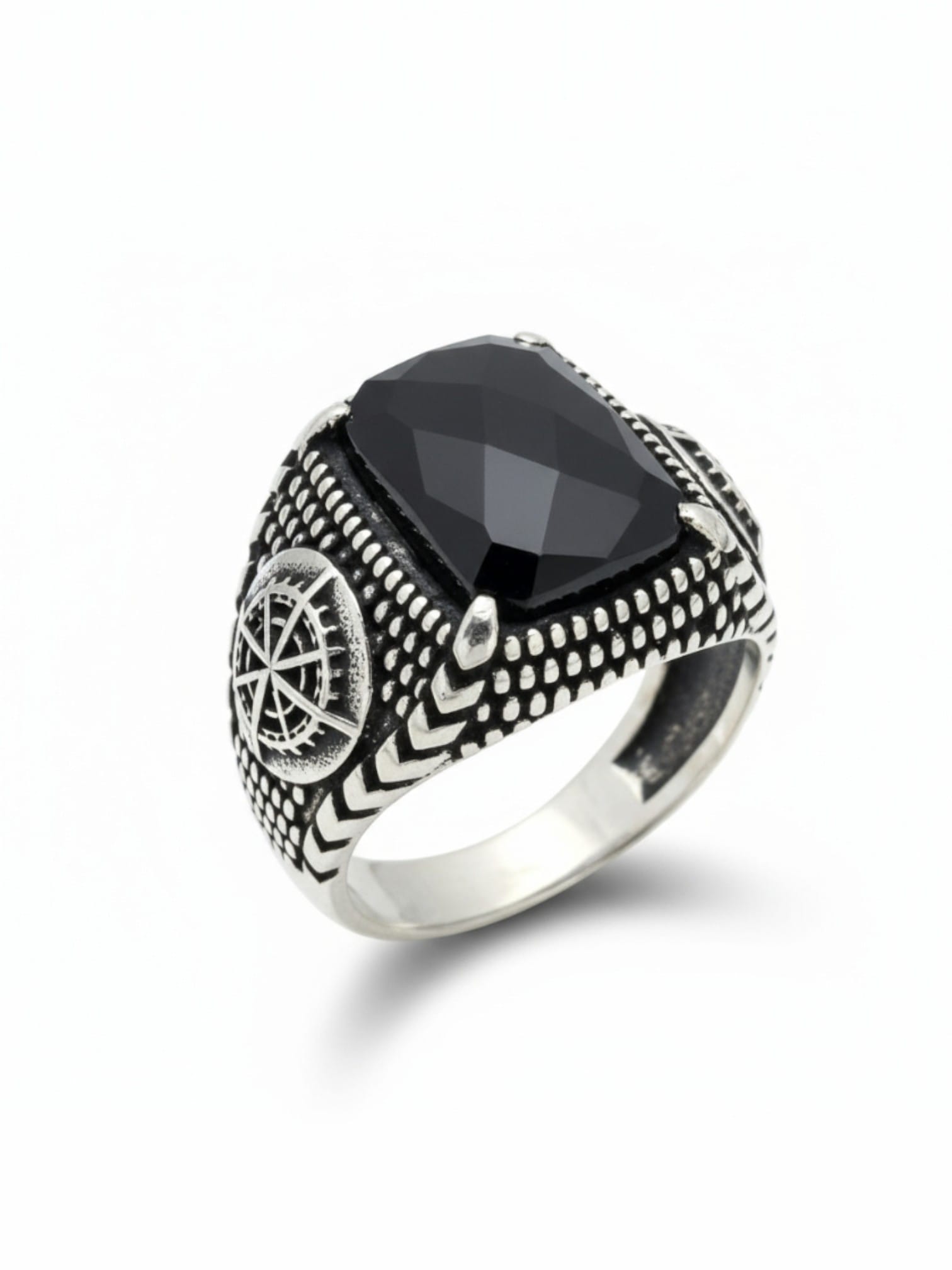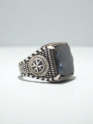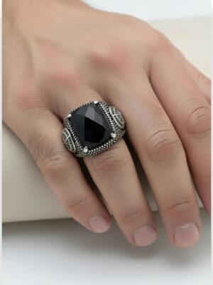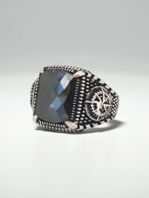 Kol Detaylarında Dümen Motifi İşlemeli , Siyah Taşlı Erkek Gümüş Yüzük