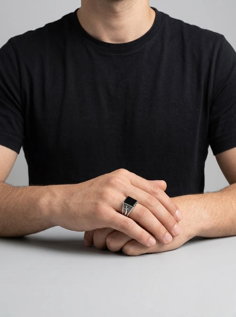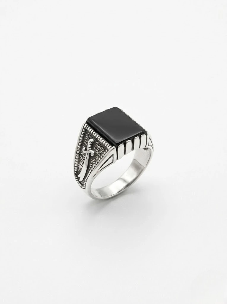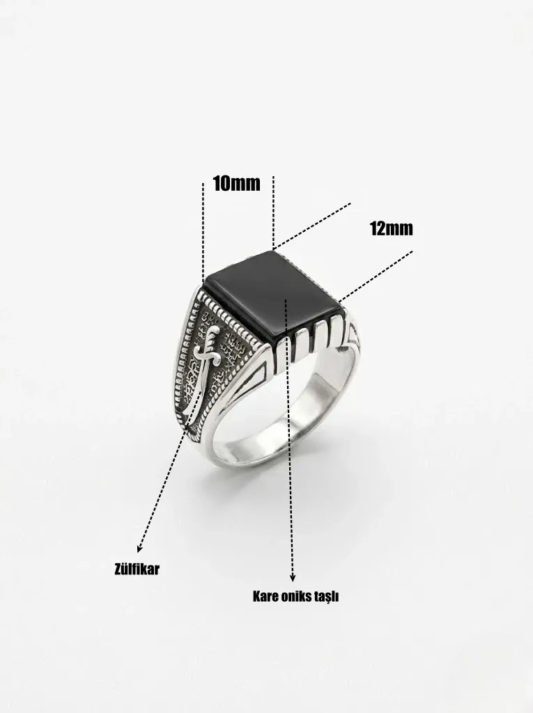 Kare oniks taşlı kol detaylarında her iki tarafta da zülfikar motifli erkek yüzük modeli