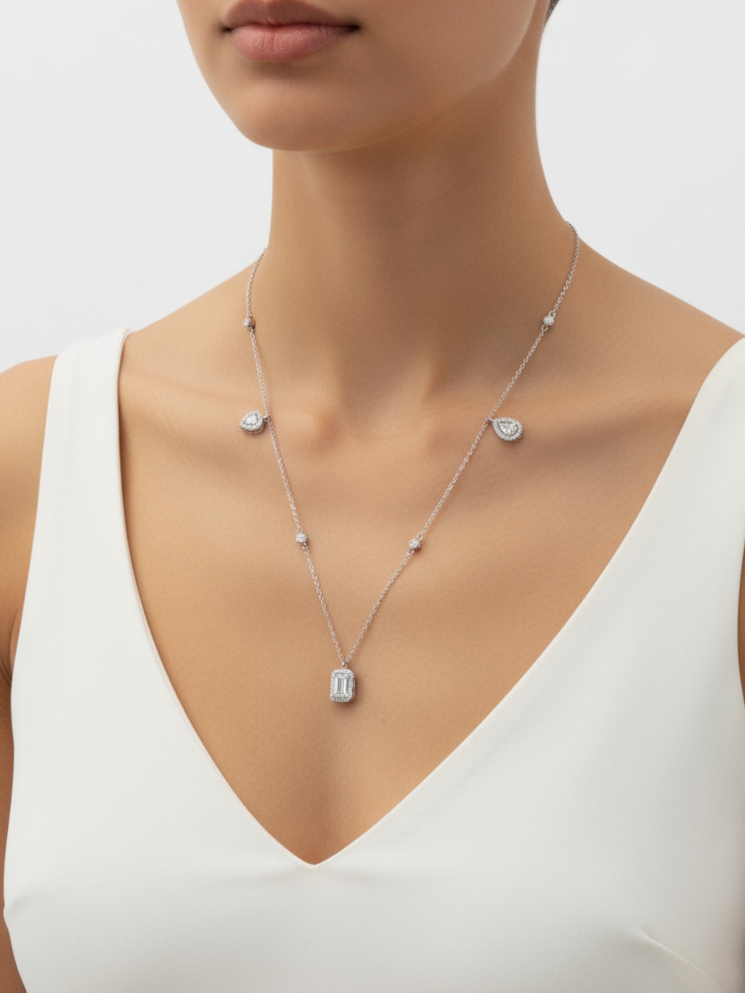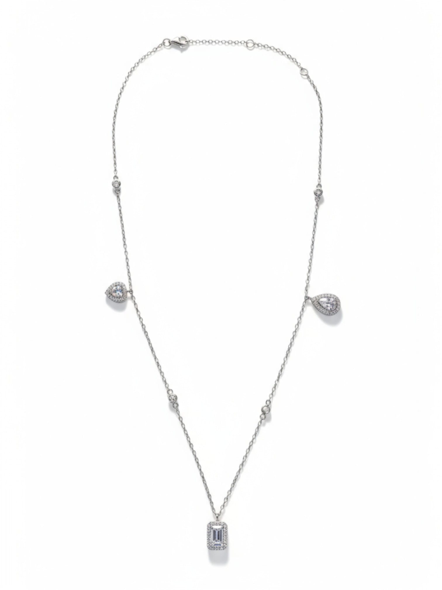 Baget, Kalp ve Damla montür zirkon taşlı kadın gümüş kolye modeli, Hem gündelik hem de özel günlerde ışığınızı en iyi yansıtacak kolye modeli, 3 farklı uzunlukta kullanabileceğiniz şekilde tasarlanmıştır.