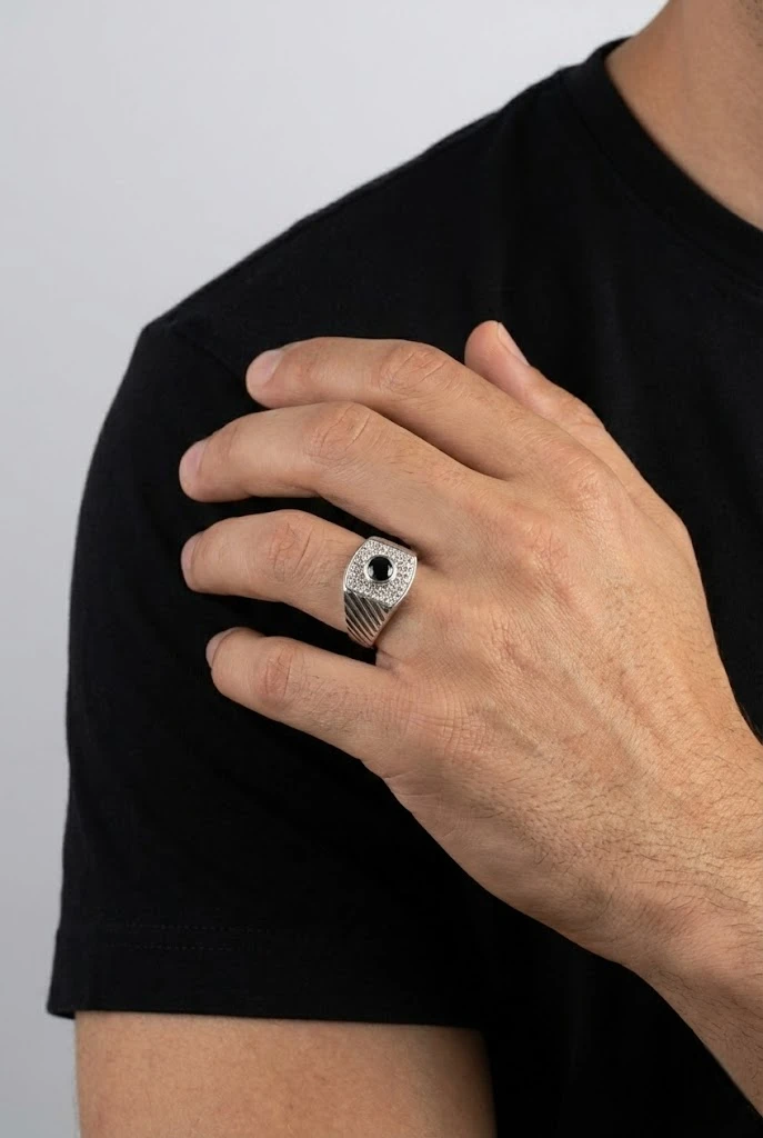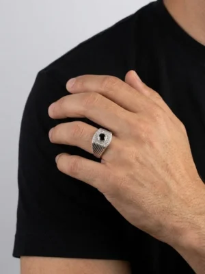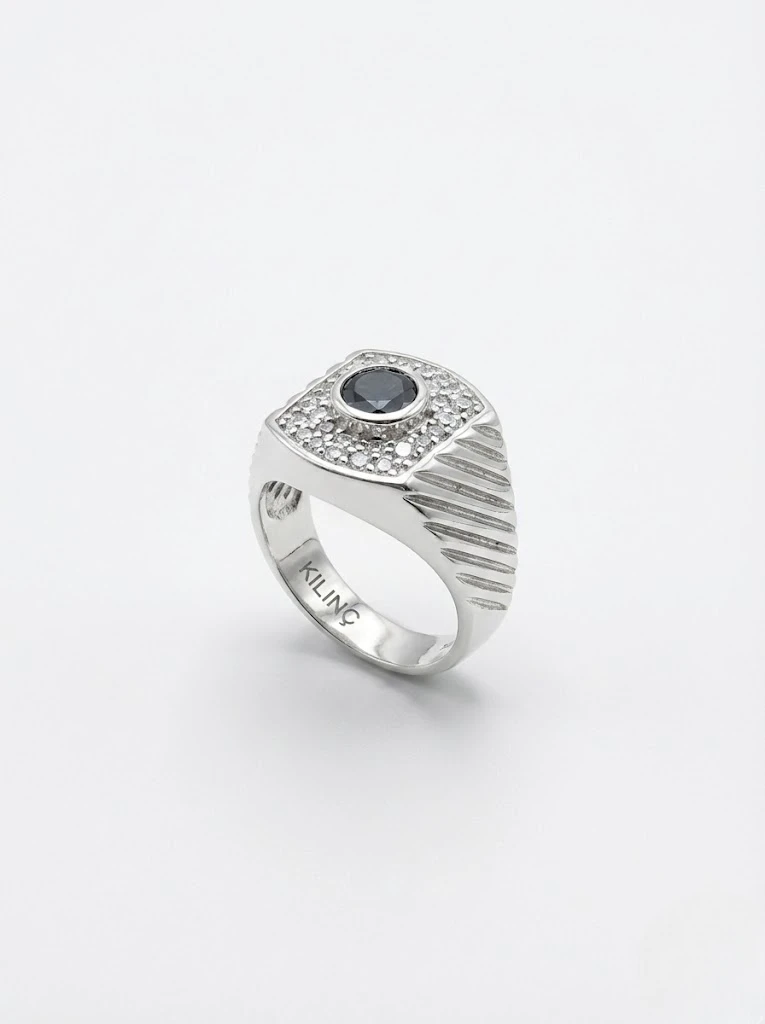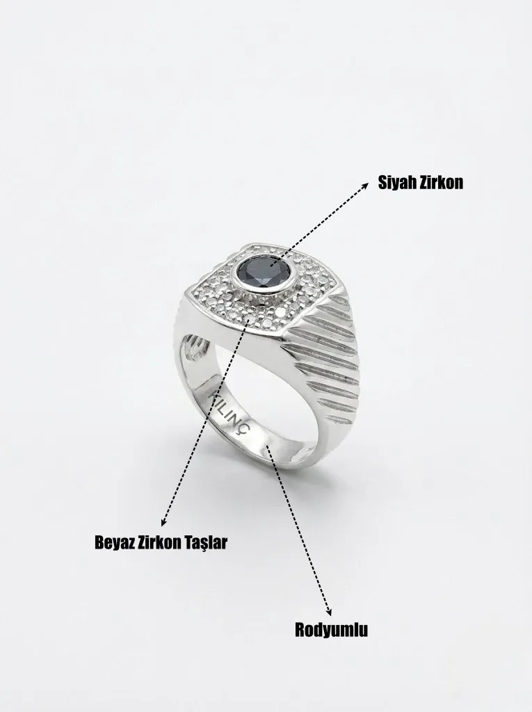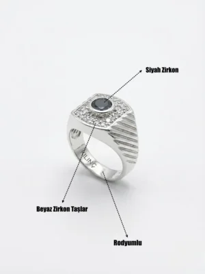 Tamamen 925 ayar gümüş üzerine rodyum kaplama yapılan bu erkek yüzük modelinin üst kısmında kırık beyaz taşlar ve küçük faset kesim siyah zirkon taş kullanılmıştır.