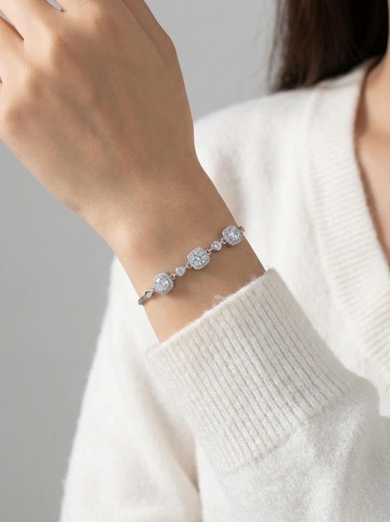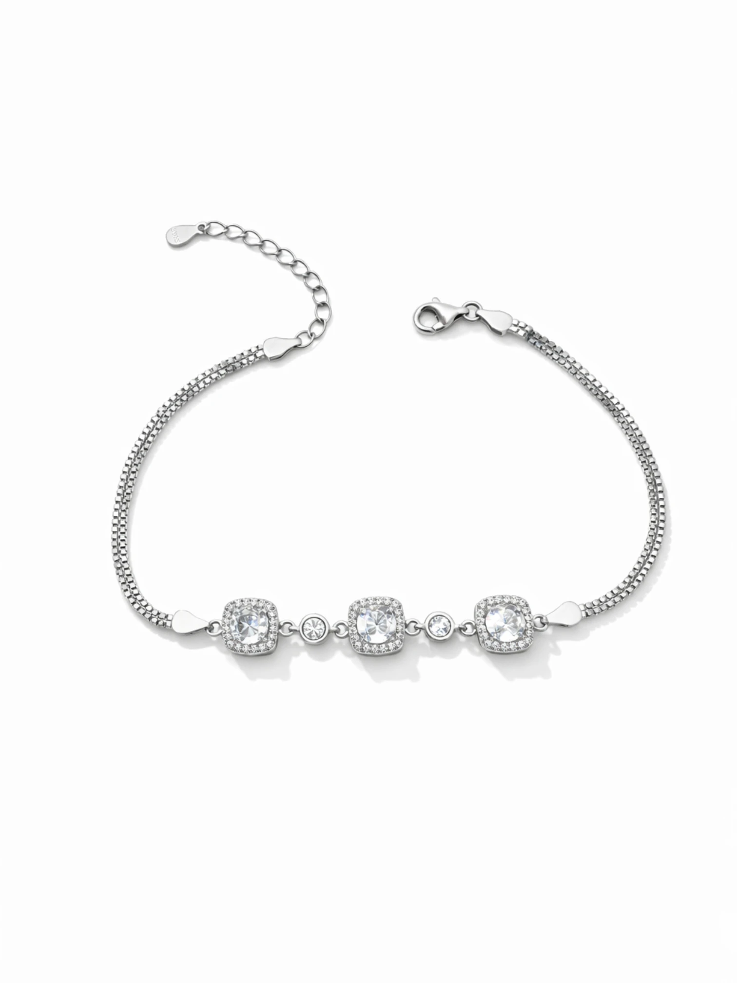 Doğal zirkon taşların kullanıldığı üç sıra baget bileklik modelinin zincir kısmında iki sıra küp zincirler tercih edilmiştir